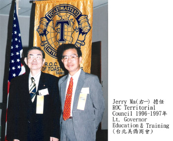 1980 年 Jerry Ma 參加 Taipei Toastmasters Club 為會員;他的會齡超過 25 年,是一位很資深 Toastmaster。1995 年 6 月會籍轉 到 China Toastmasters Club 為創始會員。 1988 年世界總會核准台灣地區 Toastmasters 成立 ROC Territorial Council (中華民國地區會議/總會)。翌年 Jerry Ma 擔任 Area 4 Governor (1989 – 1995),協助桃、竹地區分會會長會務之推展以及創立新分會。 1994 年 12 月和 1995 年 1 月 Jerry Ma 分別協助成立 Chungli Toastmasters Club 和 Hsinchu Toastmasters Club。1995 年 8 月協助成立 Taoyuan Toastmasters Club ( 1990 年擔任該會會長)。他善盡 Area Governor 之責,令人欽佩!所以在桃、竹地區之 Toastmasters 稱 Jerry Ma 為 God Father;當之無愧。 1990 年一起參加第一次 Council Meeting。爾後每年 Council 舉辦全國年會、演講比賽和各種活動,Jerry Ma 都熱心參與。所以本人跟 Jerry Ma 互動更密切、情誼也更深固。1996 年 3 月在高雄澄清湖傳習齋全國年會時,Jerry Ma 被選為 Lt. Governor Education & Training。 1996 年 7 月就任後,積極籌辦全國分會幹部訓練,Tall Tales Contest,Parliamentary Procedure Training (會議規範訓練)等,都受到與會幹部和會友的肯定和好評。 1997 年 3 月在台中 Council Meeting 被選為 ROC Territorial Council Governor。同年 7 月在高雄華園大飯店交接典禮中正式就任 Council Governor (1997 – 1998)。Jerry Ma 就職演說,提出年度主題目標 (Theme) – Dedication (奉獻)、Development (發展)和期望早日成立 District。 ( 終於 2000 年成為 District 67P )。 Jerry Ma 擔任總會長期間,特別邀請 1997 – 1998 年世界總會會長 Len Jury, DTM 參加 1998 年 ROC Territorial Council Convention;全國會友聞名前來參加大會,聆聽世界總會會長之金言玉語。 德亮兄熱心參與國際事務。1998 年 5 月率領 40 多位會友前往菲律賓宿霧 (Cebu),全程參與 District 75 年會,受到 District Governor Johnny Uy 熱烈歡迎並奉為上賓。可謂成功的國民外交。( Johnny Uy在今年八月華盛頓世界大會被選為 2006 – 2007 年世界總會會長 )。 1999 年 5 月 Jerry Ma 以前一任總會長身份和其他會友到新加坡參加舊 District 51 ( 馬、新、泰、印尼、香港等地區 ) 總會年會,與 Pan Asia Toastmasters 結緣,提高 Taiwan Toastmasters 在亞洲地區知名度。 眾人皆知,德亮兄為人幽默風趣、熱心助人、常保一份赤子之心,而且平易近人。有時候一句自嘲式笑話,也令人會心一笑。1997 年參加屏東英語演講會成立大會/晚會。屏東分會幹部因籌備期間有些勞累,而要先離開。Jerry Ma説:「主人要先走,客人只好留下來。」 也有引人省思的雋語:"If we don't think we are able to do big thing, why can't we do small things in a big way?" (由 Past Council Governor Harry Fong 提供)。 德亮兄辭世令人不捨和哀傷。願他安息在主的懷裡! May God rest his soul!