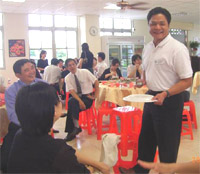 演講會開到一半,廚房開始上菜,原本吵雜的餐廳立即安靜,連地上掉根針都可以聽得到。陸陸續續上桌的佳餚,真是傻了大夥的眼睛,原先以前是素食便當,當看到媲美婚宴的豐盛午餐,大家再也無法抗拒眼前的美食,紛紛要求稟彬暫停十分鐘即席問答。中壢客家師傅的手藝真不是蓋的,色香味俱全(經過這場試吃會,我也考慮到中壢辦告別式),如果事前演講會友知道 有這場午餐的饗宴,我打包票會有超過二百位會友參加這場即席演講,創下金氏世界紀錄。