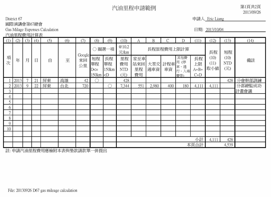 汽油里程費用申請表範例