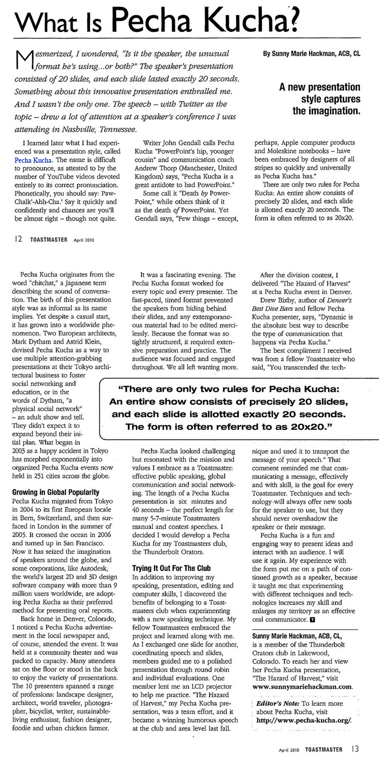是記憶術?是演講者特用的形式?或兩者皆是?20 張幻燈片,每張呈現 20 秒,這麼扼要的創新呈現方法,我在參加田納西州 Nashville 市所辦的演講會上首見,以 Twitter(顫慄)為主題的演講,吸引了眾多矚目,令人刮目相看。 後來,我才知道這樣的呈現風格,稱為 Pecha Kucha.這麼難發音的名詞,多虧 YouTube 影片上的發表,才得以糾正。作家 John Gendall 稱 Pecha Kucha 為 PowerPoint 的精隨、新銳。而英國曼澈斯特溝通訓練師Andrew Thorp說,Pecha Kucha 是中毒壞死 PowerPoint(PPT) 的解毒劑。 當有人稱呼它為「PowerPoint 的終結者」,同時也有人認為應該是「被 PowerPoint 殺死」。但 Gendall說:「可能除了蘋果電腦之外,很少人會感覺到被設計這種 Pecha Kucha,並很快的影響全世界。」 Pecha Kucha 只有兩項原則:整場展現剛剛好 20 張幻燈片,每張準確無誤地呈現 20 秒,以 20x20 的公式說明,呈現清楚易懂的表現方式。 Pecha Kucha 源自於 chitchat 這個字,日語形容對話的聲音。這種呈現風格如其名般非正式衍生,如此無心插柳卻風行全球。歐洲兩位建築師 Mark Dytham 及 Astrid Klen 運用 Pecha Kucha 在東京商務會議上,深入淺出說明社會連結網與教育,甚至說明了 Dytham 一詞,實際的社會連結網.這場 2003 年東京會議上的愉快經驗,出人意外的發展成全球 213 個城市普遍運用的 Pecha Kucha。 逐漸全球風行 Pecha Kucha 2004年自東京發燒,首站瑞士伯恩市 Bern,緊接 2005 年夏,英國倫敦,2006 年漂洋過海首現於舊金山。全球的演說家們紛紛採行,甚至客戶群超過 9百萬世界最大的 2D/3D 軟體公司 Autodesk,也偏好 Pecha Kucha 為口頭報告的呈現方法。 在老家科羅拉多州丹佛市 Denver,我注意到地方報一則 Pecha Kucha 訓練廣告並報名參加。地點在一家社區劇院,參加者全場爆滿,甚至席地而坐,欣賞著豐富的呈現表演。十位演講者來自各行各業:景觀設計師、建築師、環球旅行家、攝影師、單車行家、作家、生存考驗熱好者、服裝設計師、食品專家、及鄉村雞農。 這是一場難得的盛會,Pecha Kucha被運用在每一場主題演講。這種快節奏計時的形式,主講人無法藏於螢幕之後,,手邊的資料都需嚴謹地編輯,嚴謹的格式更需額外的準備與練習。全場觀眾座無虛席,全神貫注,離席時仍意猶未盡呢! Pecha Kucha 看似極具挑戰,但以身為 Toastmaster,我可以歸納其使命與價值為:有效能的公眾演講,全球溝通與社會連絡網際。一場 Pecha Kucha 的呈現為 6 分 40 秒。很適合 5-7 分鐘演講串聯。我決定要在自己的母會 Thunderbolt Orators 分會推行。 適行於TM例會 為了增進演說、表現、編輯、與電腦使用技能,我運用這項新的演說科技在自己母會,並受惠這種更有歸屬感的夥伴關係。我的會友和我一起學習成長。當我切換不同幻燈片,整合演說內容與畫面,會友們以 round robin 方式(註:進階演講手冊 Discussion Leader 中第二講 The Round Robin 有詳細說明)及個人回饋協助我修正。有一位借我 LCD projector,讓我練習”The Hazard of Harvest”(收穫) 這次的 Pecha Kucha 呈現是團隊的努力,從會內幽默演講賽直比到區域賽。我在 Denver 演說完後,Denver's Best Dive Bar 作者,也同是 Pecha Kucha 高手的 Drew Bixby 先生評論說:「以 Pecha Kucha 來詮釋這類溝通技巧,你個人散發的動力無疑是最好的表現。」 我聽過最棒的讚美來自另一位會友;你純熟地運用 Pecha Kucha,將自己的演說訊息傳達淋漓盡致;這提醒了我,對每一位 Toastmasters 而言,有效地運用技巧其目的是傳達演說的訊息.不可過度運用而忽略其訊息。 Pecha Kucha 十分有趣並適運用於呈現想法與觀眾互動,用心學以致用 Pecha Kucha 技巧,使我不斷學習成長為優質的演說家並且不斷增廣見聞。