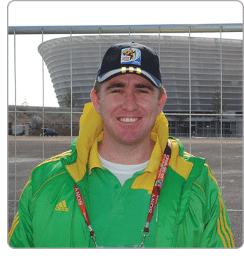 Two South African Toastmasters volunteer at historic soccer event. 兩位南非演講會會員在歷史性的足球賽事中擔任義工。 |